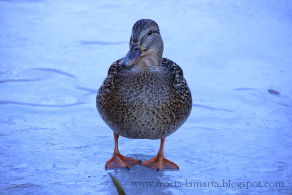 Głównie fotografowałam samotne kaczki na skutym lodem stawie: